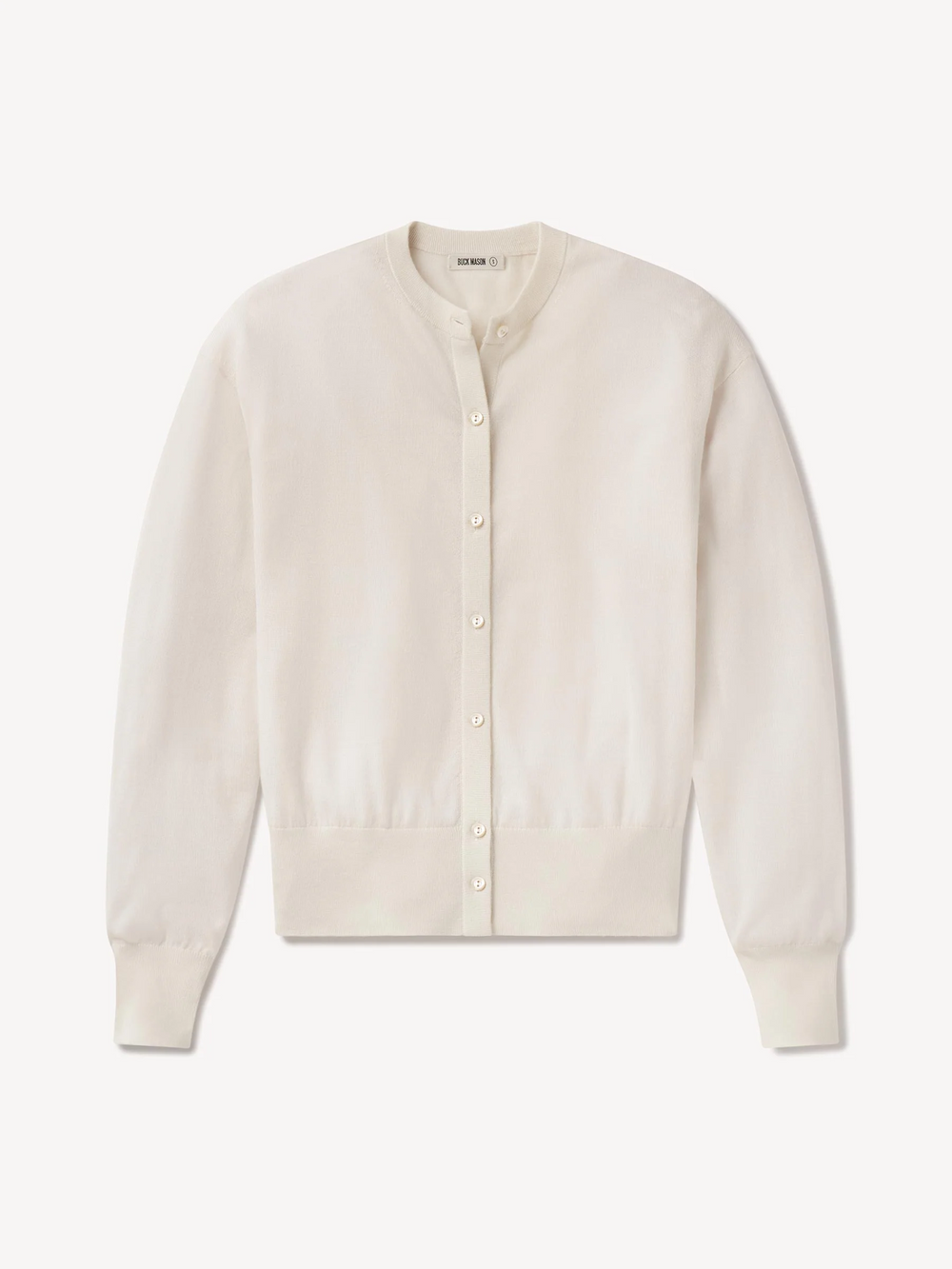 Classic jersey stitch cardigan with a relaxed, slim fit. Spun from a yarn-dyed blend of merino wool, silk, and cashmere. Garment washed for added softness and finished with mother of pearl buttons.