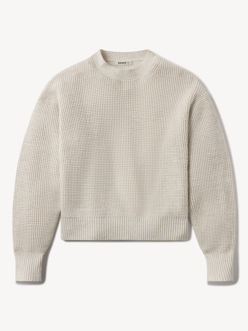 1960s inspired crewneck sweater with an easy, slim fit. Crafted from 7-gauge waffle knit yarn-dyed cotton with a light slub texture, featuring fashioning at the neck and drop-back shoulders as a nod to mid-century.