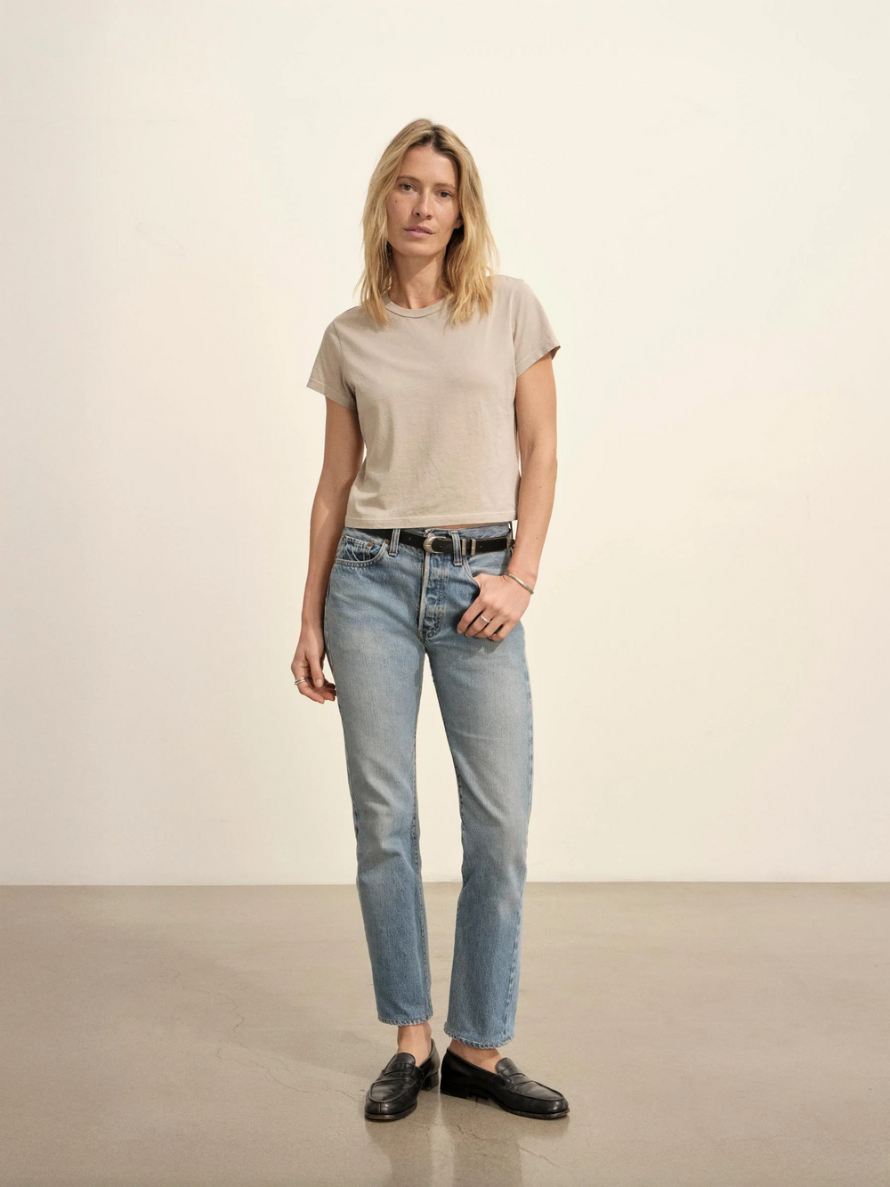 Boxy short sleeve crewneck tee with a straight hem. Cut from 120 GSM Supima cotton. Constructed with rib neck binding and double-needle cover-stitching at the hem. Garment washed for a lived-in feel.